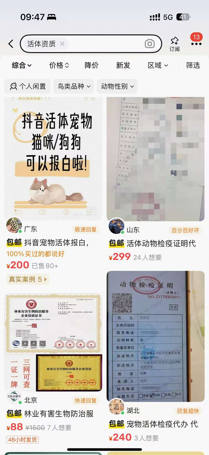 问题不止于此,在社交媒体平台,有多名金丝熊、鹦鹉商家发帖咨询“如何谈快递价格”,表示检疫等证明无法办理,导致不能自行邮寄,需寻找批量代发。“代发代办宠物快递资质”成了一种新生意,有人持各种检疫证明样证图片宣称提供“代办”服务,另有不少有资质的商家通过“快递代下单”服务赚差价。