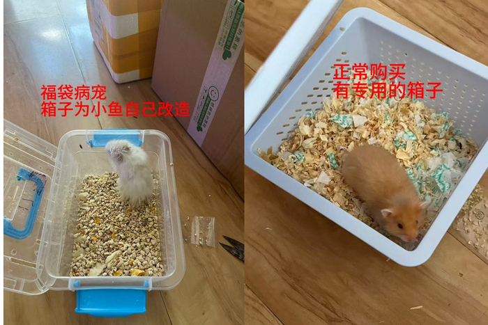 是福袋的问题吗?小鱼又在同家店铺购买了一只仓鼠,这次她发现,中奖的仓鼠和原价购买的仓鼠,从包装到状态都有所不同。中奖的仓鼠用普通快递盒加塑料箱简陋包装,后续购买的仓鼠则有专用的篮子,更重要的是,自费购买的这只状态十分健康。