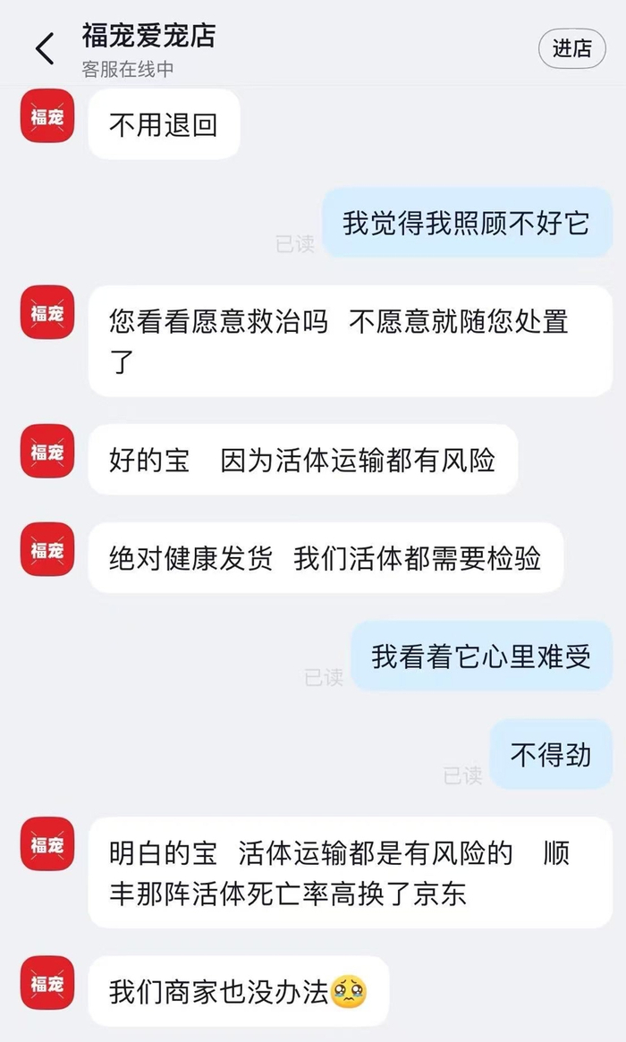 随手一点“抖音”直播间的福袋,竟然抽中了一只宠物仓鼠?对消费者“鱼干”来说,这原本是一桩幸运。今年10月,她在平台“福宠爱宠店”抽到了一只仓鼠,满怀期待等着新宠上门,收到后却发现,仓鼠两只眼睛都已经失明,健康状态非常差。当她再联系商家询问如何处理,商家却表示“随机发货不售后”,并让她“随意处置”。中奖“惊喜”变成了“惊吓”,鱼干看着仓鼠一点点走向死亡,心里也蒙上了阴影。