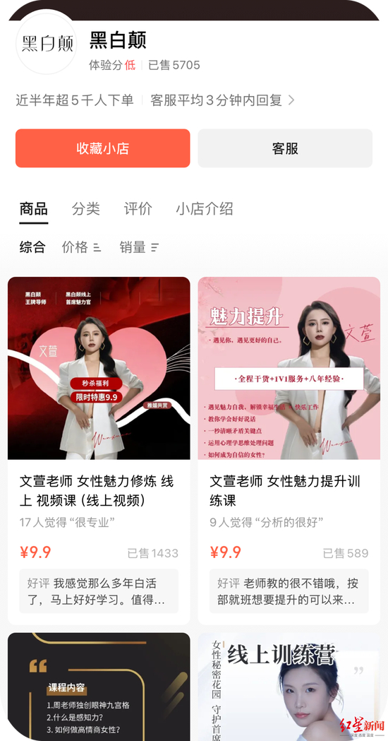 除了线下课外,红星新闻记者注意到,“黑白颠”还设有线上课销售,例如其在某线上小店内就有5种单价9.9元的课程,包括“女性魅力修炼”等内容,销售记录显示已售出超5700份。