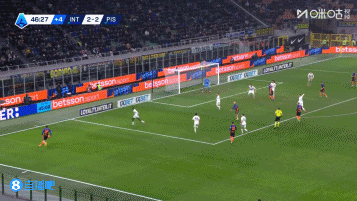 第90+6分钟,国米左侧角球开到禁区,第一点双方争顶,乱战中门前姆希塔良头槌破门!国米6-2比萨↓