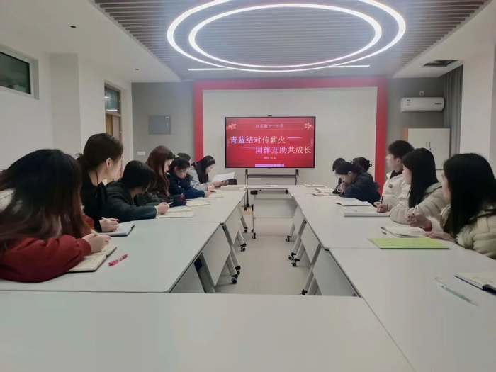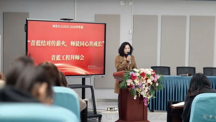教导处单莉主任宣读本年度师徒结对名单、互助小组名单及青蓝工程实施细则,明确双方职责与成长方向。