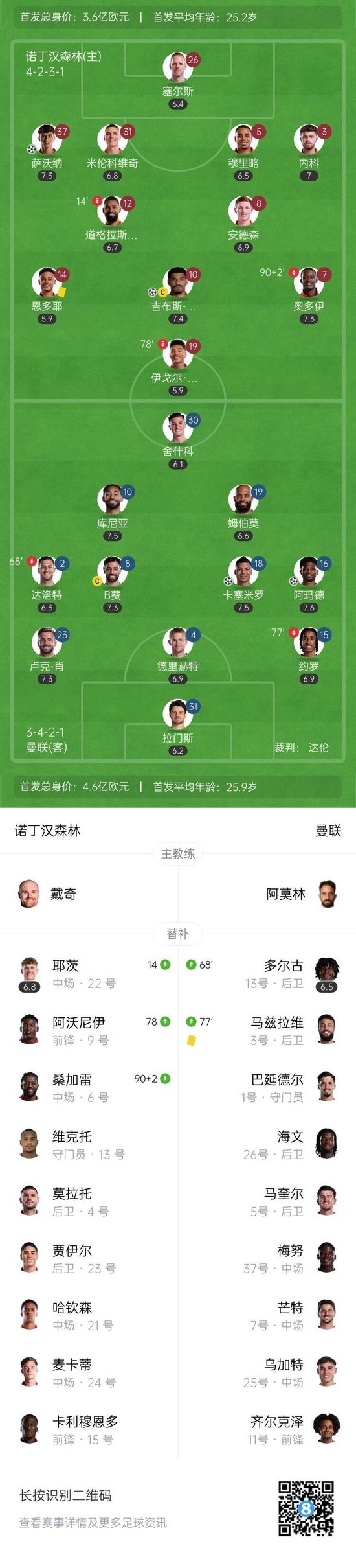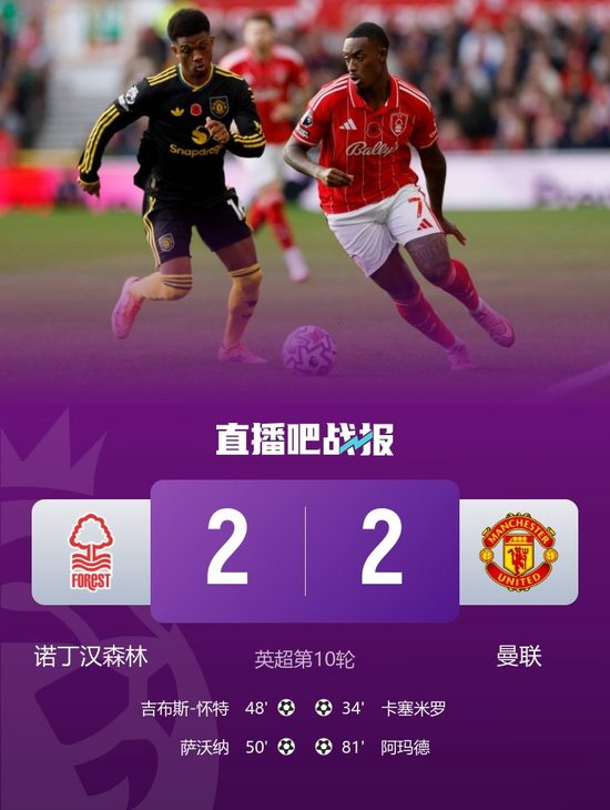 直播吧11月2日讯 北京时间11月1日晚上23:00,英超第10轮,诺丁汉森林坐镇诺丁汉城市足球场迎战曼联。上半场,道格拉斯-路易斯伤退,卡塞米罗头球破门。下半场,吉布斯-怀特、萨沃纳3分钟完成反超,阿玛德世界波扳平。全场结束,诺丁汉森林2-2曼联。本场过后,曼联积17分暂升第5,诺丁汉森林积6分排名第18。