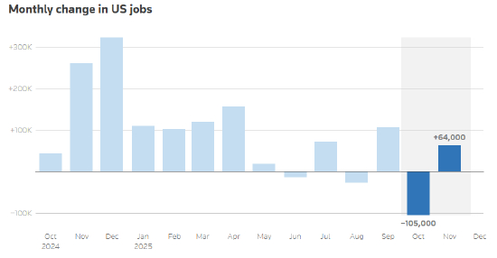 受政府削减开支影响,美国 10 月非农就业人数下降,11 月就业增长出现反弹。但在美国总统特朗普激进贸易政策引发经济不确定性的背景下,劳动力市场疲软,失业率维持在 4.6%。美国劳工统计局周二发布了延迟的 11 月就业报告及 10 月部分更新数据。由于政府长达 43 天的停摆导致家庭数据收集受阻,此次报告未包含 10 月失业率及其他相关指标。