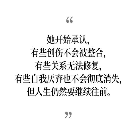 这是一种非常反叙事的成长方式。她依然会犯错,依然会感到羞愧,依然无法彻底摆脱自我厌弃,但她开始承认失去、承认悲伤,也承认自己并非永远需要被观看、被解释。最终那个不再看向镜头的背影,并不是“治愈”的象征,而是她终于愿意独自面对现实世界的证明。